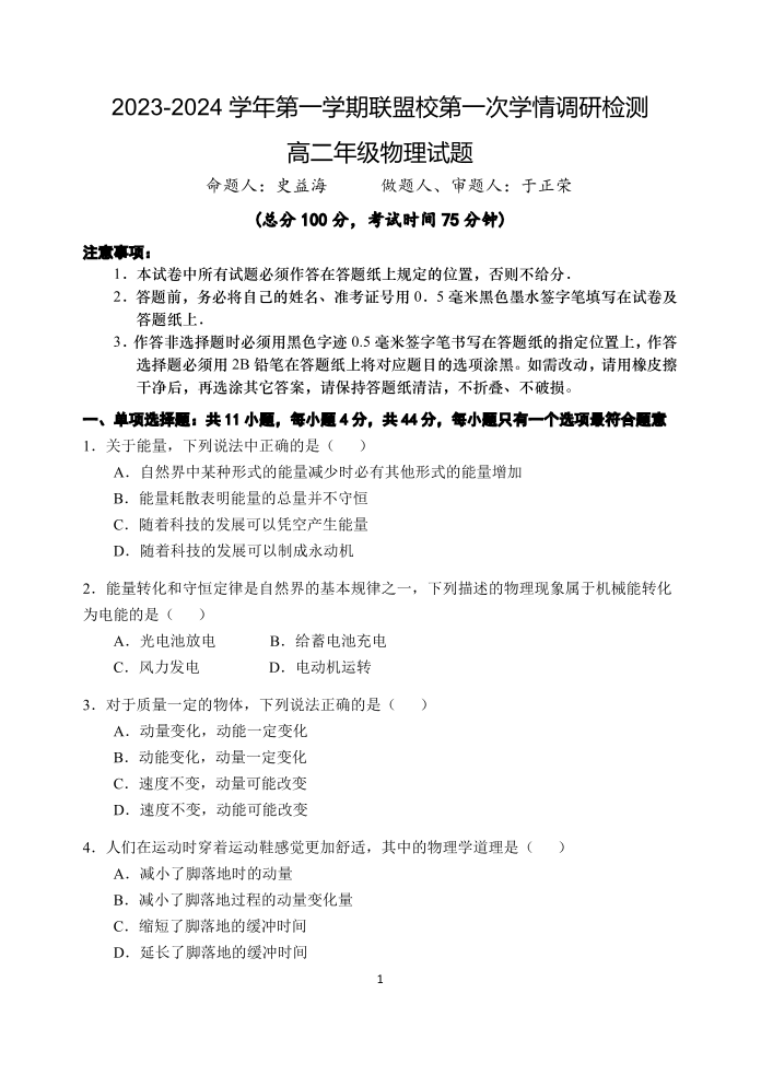 江苏省盐城市五校联考2023-2024学年高二上学期10月月考物理