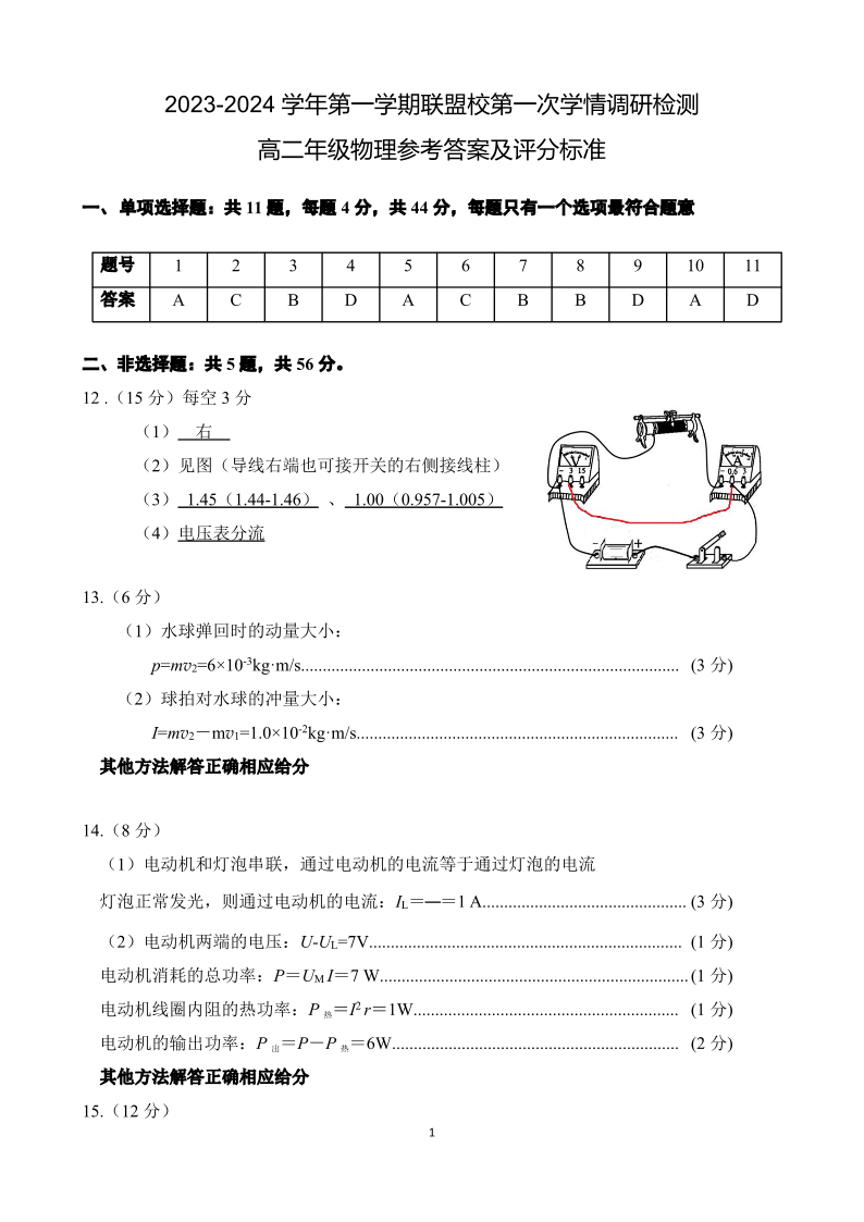 江苏省盐城市五校联考2023-2024学年高二上学期10月月考物理答案