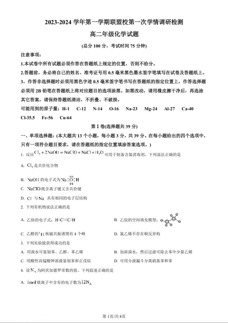 江苏省盐城市五校联考2023-2024学年高二上学期10月月考化学(原卷版)
