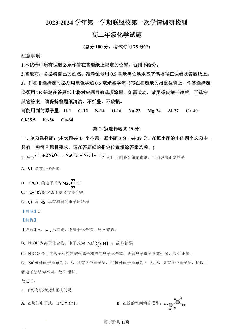江苏省盐城市五校联考2023-2024学年高二上学期10月月考化学(精品解析版)