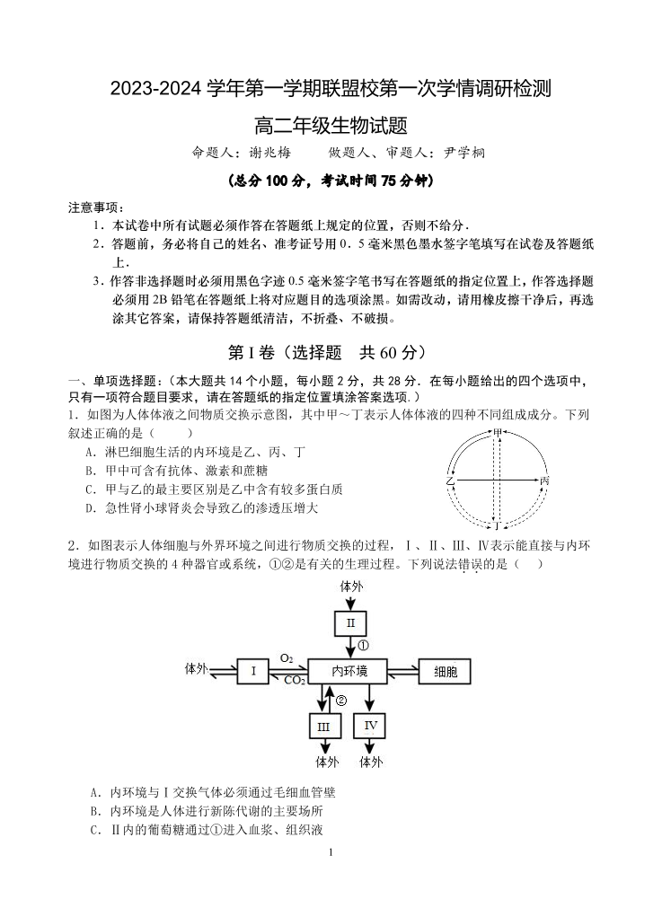 江苏省盐城市五校联考2023-2024学年高二上学期10月月考生物