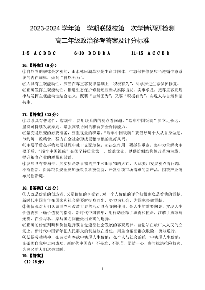 江苏省盐城市五校联考2023-2024学年高二上学期10月月考政治答案