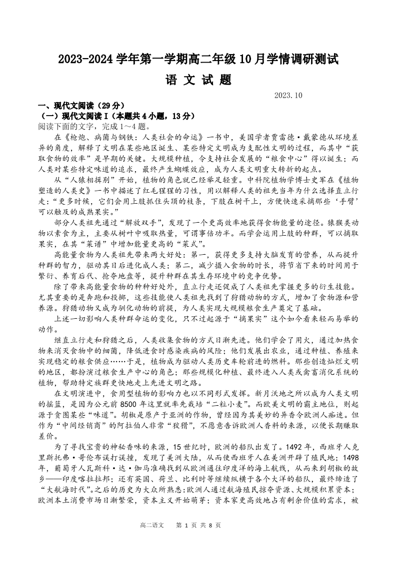 江苏省扬州市高邮市2023-2024学年高二上学期10月月考试题语文