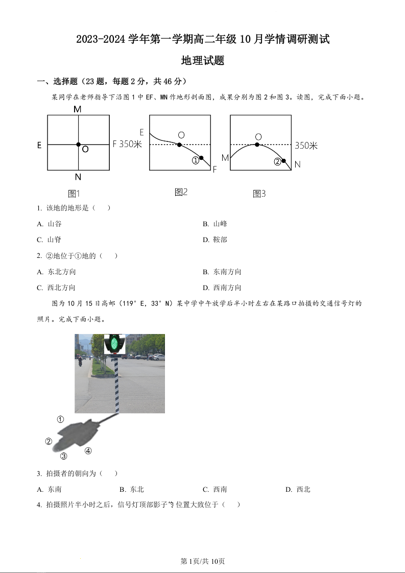 江苏省扬州市高邮市2023-2024学年高二上学期10月月考试题地理(原卷版)