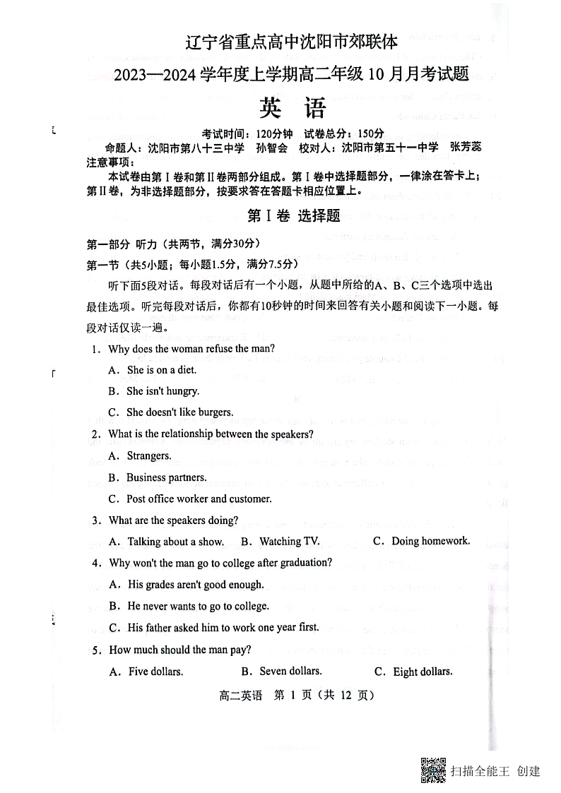 辽宁省重点高中沈阳市郊联体2023-2024学年高二上学期10月月考英语+答案
