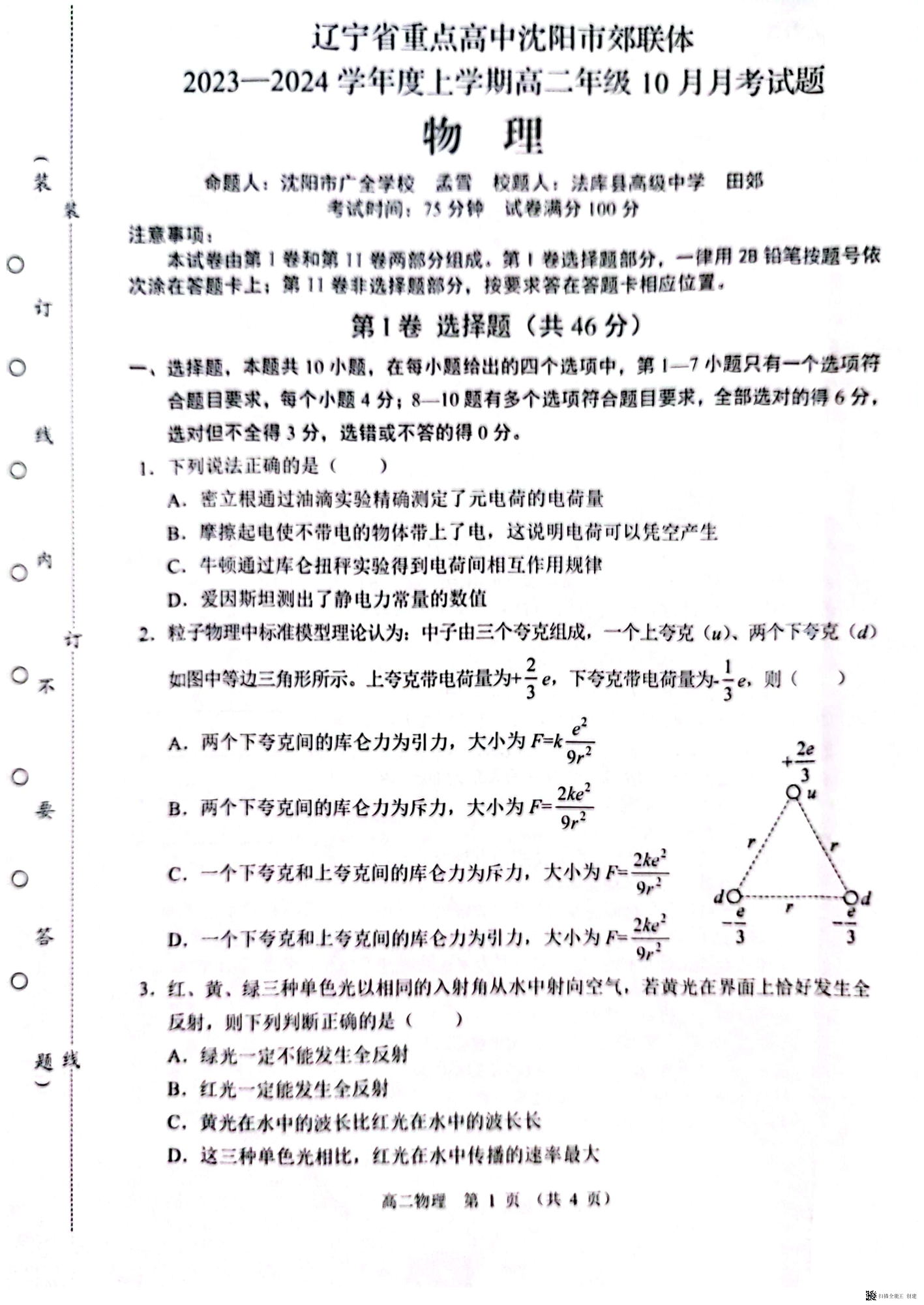 辽宁省重点高中沈阳市郊联体2023-2024学年高二上学期10月月考物理+答案