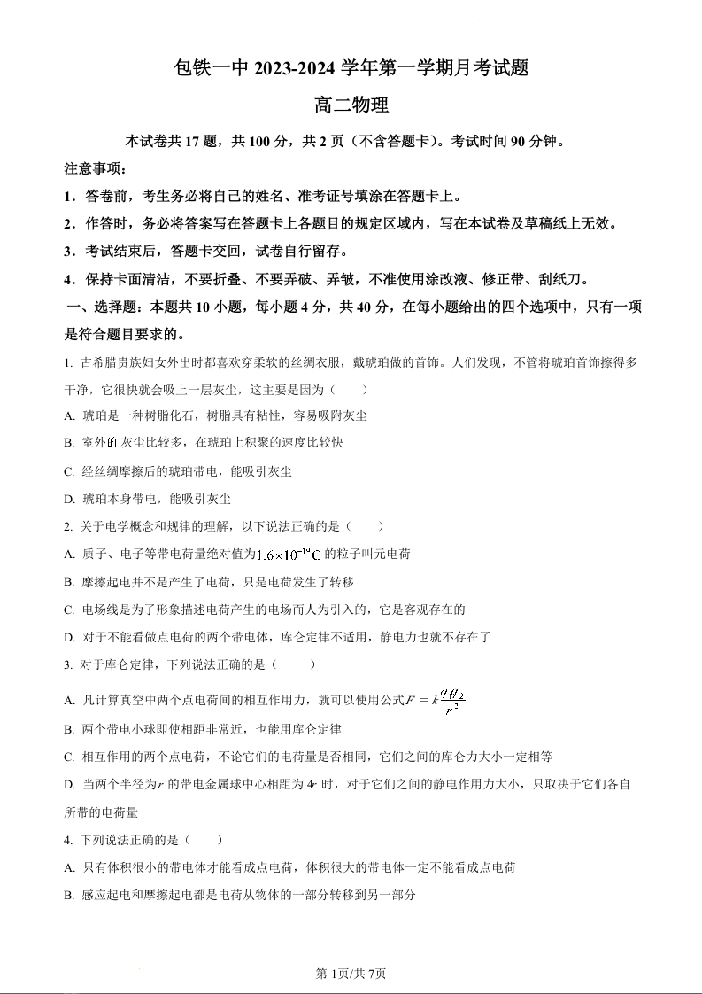 内蒙古包头铁路第一中学2023-2024学年高二上学期第一次月考试题物理(原卷版)