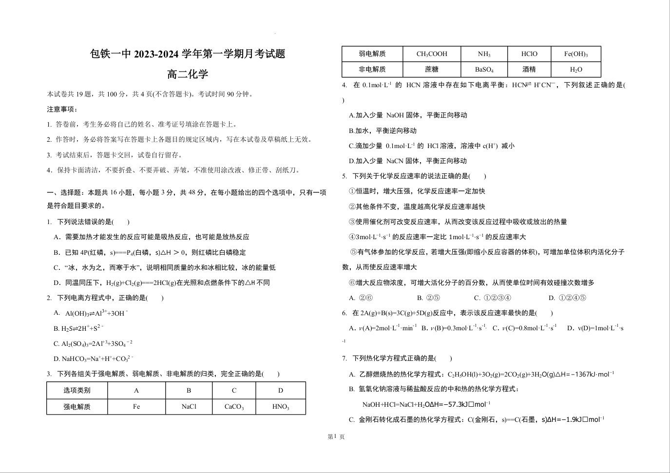 内蒙古包头铁路第一中学2023-2024学年高二上学期第一次月考试题化学+答案