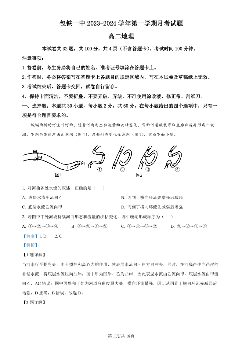 内蒙古包头铁路第一中学2023-2024学年高二上学期第一次月考试题地理(精品解析版)