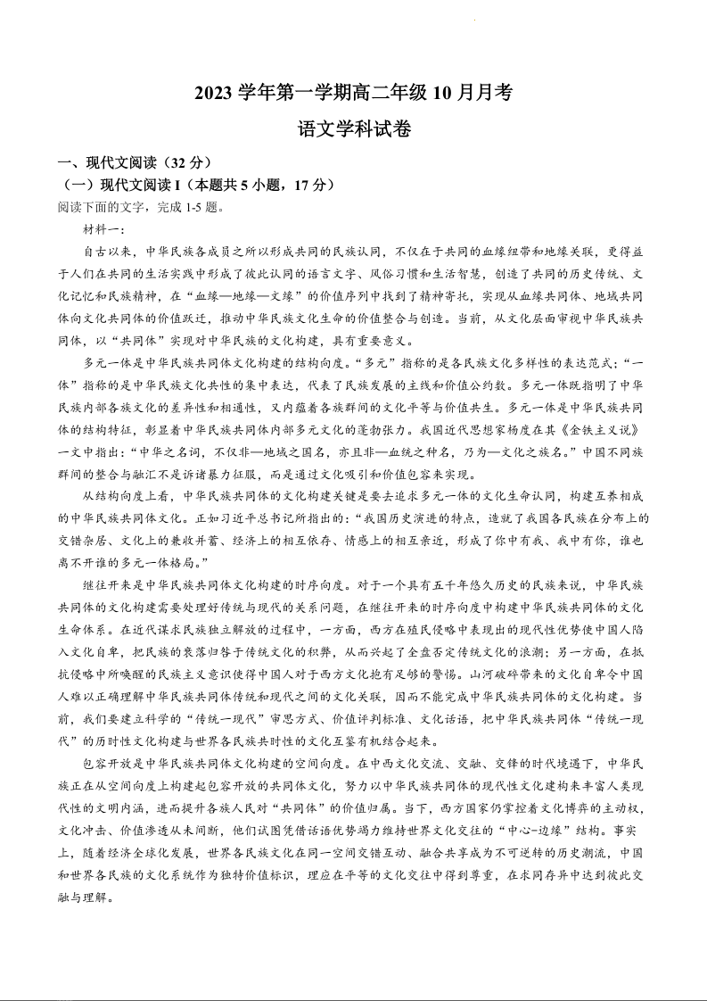 内蒙古赤峰实验中学2023-2024学年高二上学期10月月考试题语文+答案