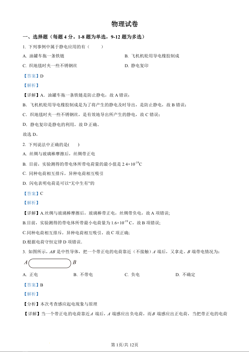 内蒙古赤峰实验中学2023-2024学年高二上学期10月月考试题物理(精品解析版)