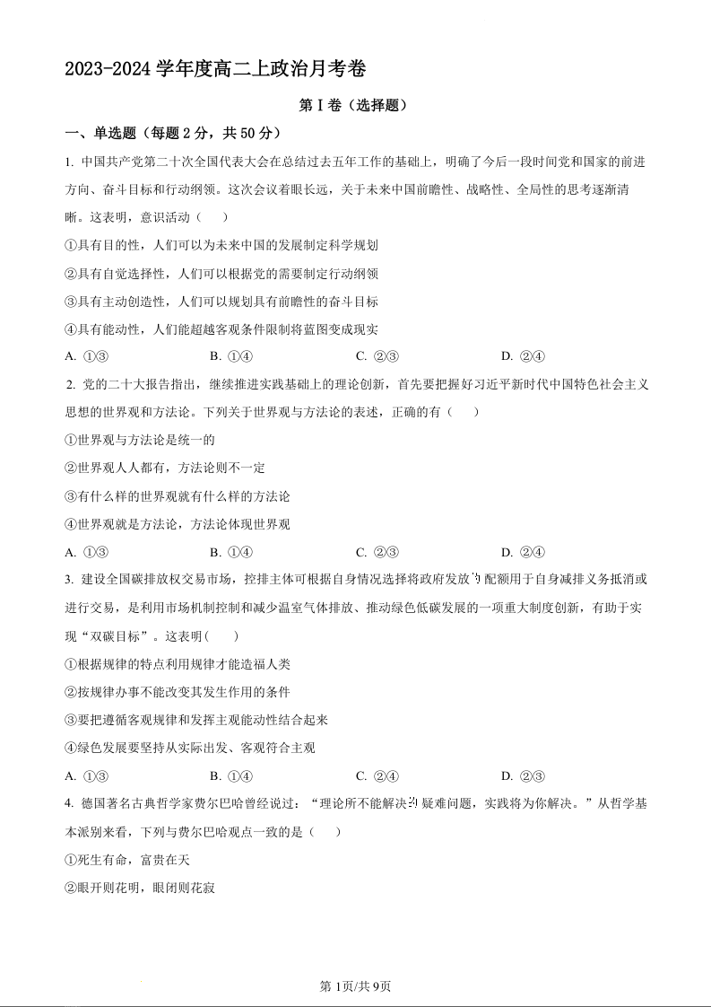 内蒙古赤峰实验中学2023-2024学年高二上学期10月月考试题政治(原卷版)