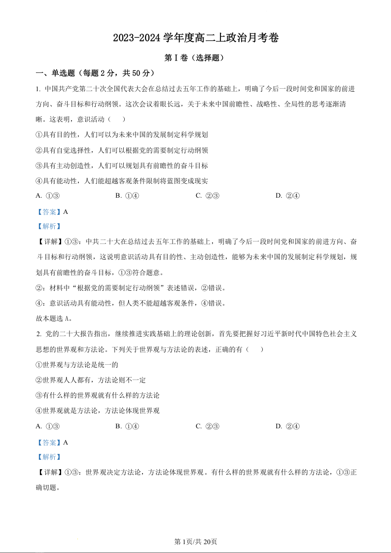 内蒙古赤峰实验中学2023-2024学年高二上学期10月月考试题政治(精品解析版)