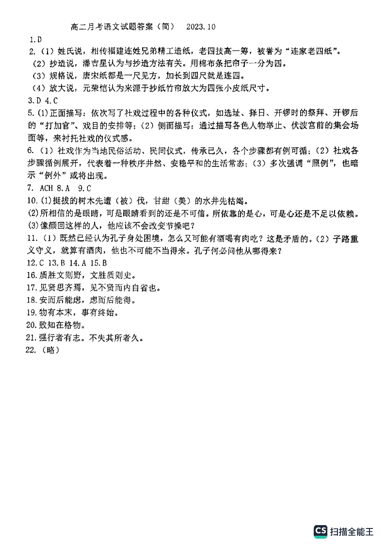 山东省济南市实验中学2023-2024学年高二上学期10月月考语文答案