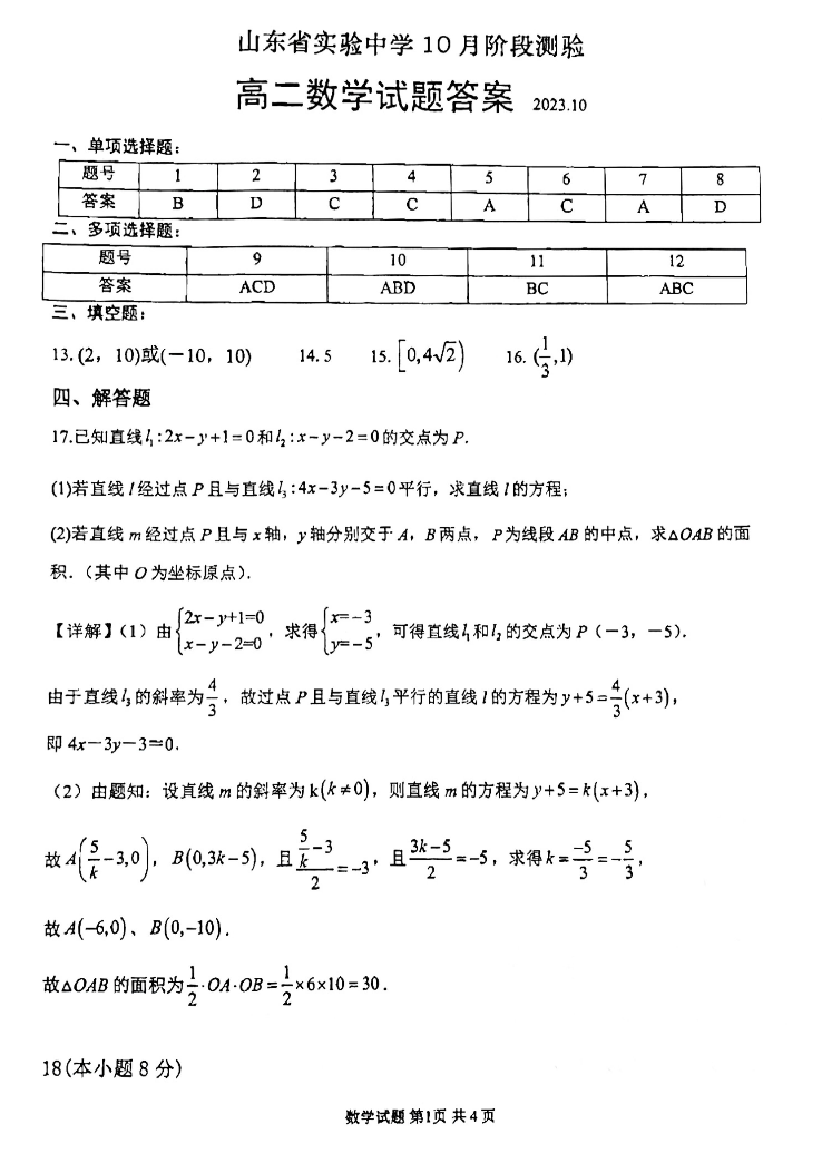 山东省济南市实验中学2023-2024学年高二上学期10月月考数学答案