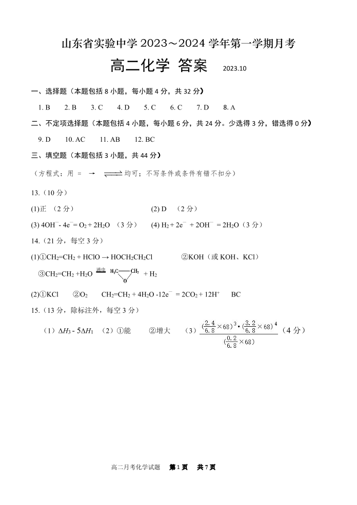 山东省济南市实验中学2023-2024学年高二上学期10月月考化学答案