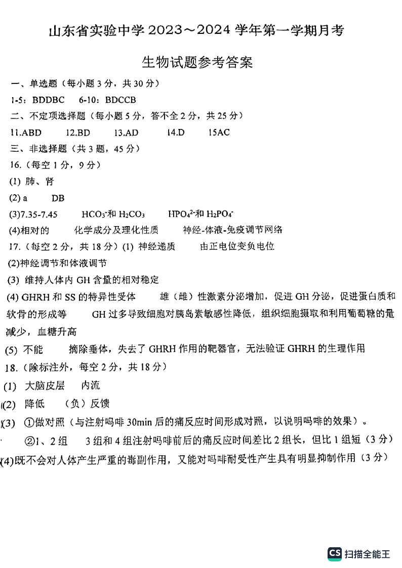 山东省济南市实验中学2023-2024学年高二上学期10月月考生物答案