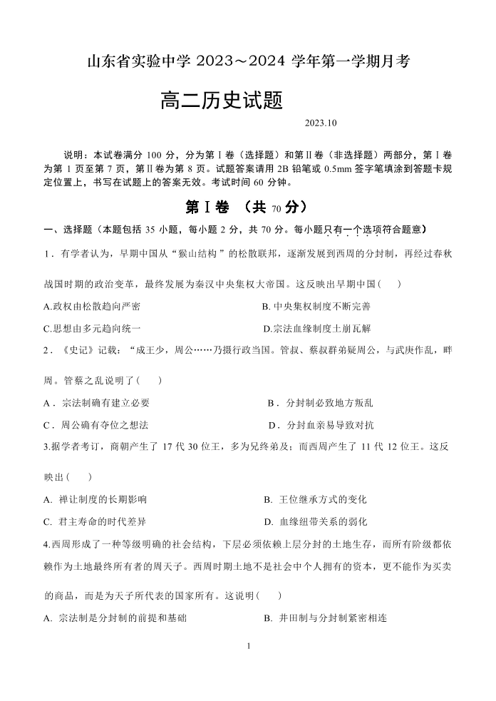 山东省济南市实验中学2023-2024学年高二上学期10月月考历史