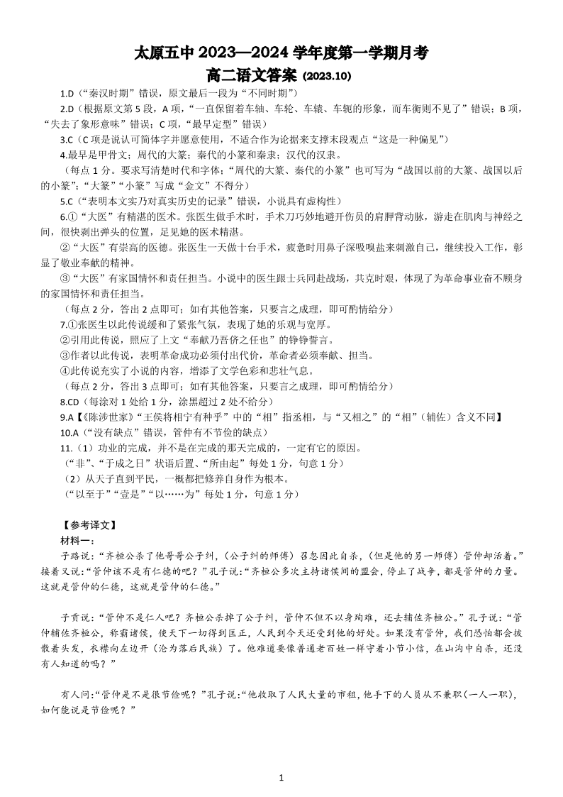 山西省太原市第五中学校2023-2024学年高二上学期10月月考试题语文答案