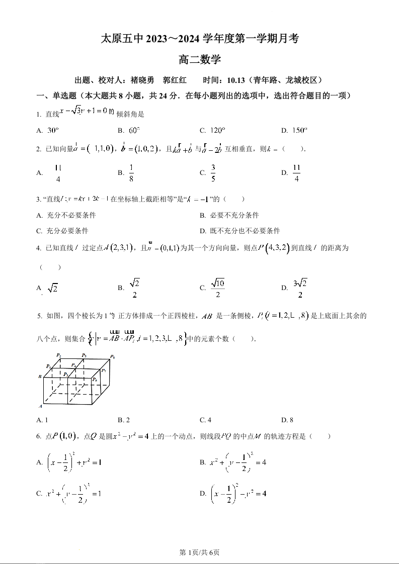 山西省太原市第五中学校2023-2024学年高二上学期10月月考试题数学(原卷版)
