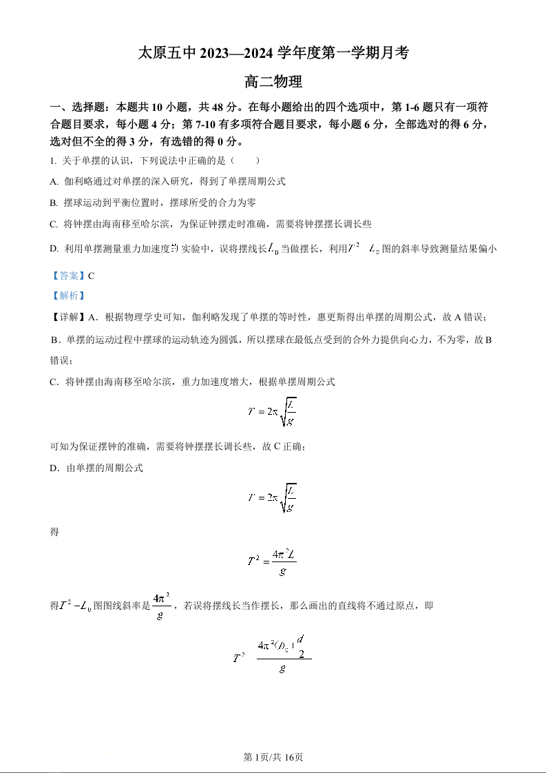 山西省太原市第五中学校2023-2024学年高二上学期10月月考试题物理(理科)(精品解析版)