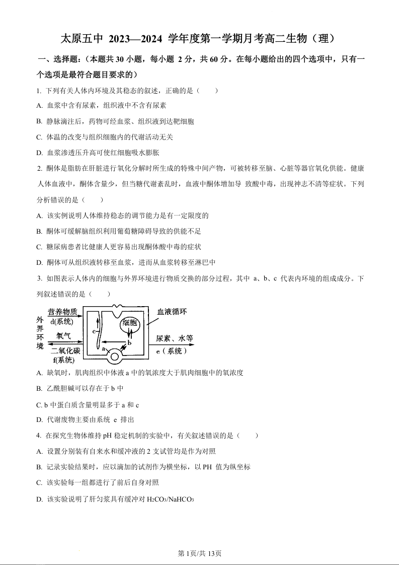 山西省太原市第五中学校2023-2024学年高二上学期10月月考试题生物(原卷版)
