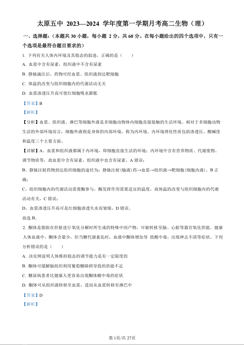 山西省太原市第五中学校2023-2024学年高二上学期10月月考试题生物(精品解析版)