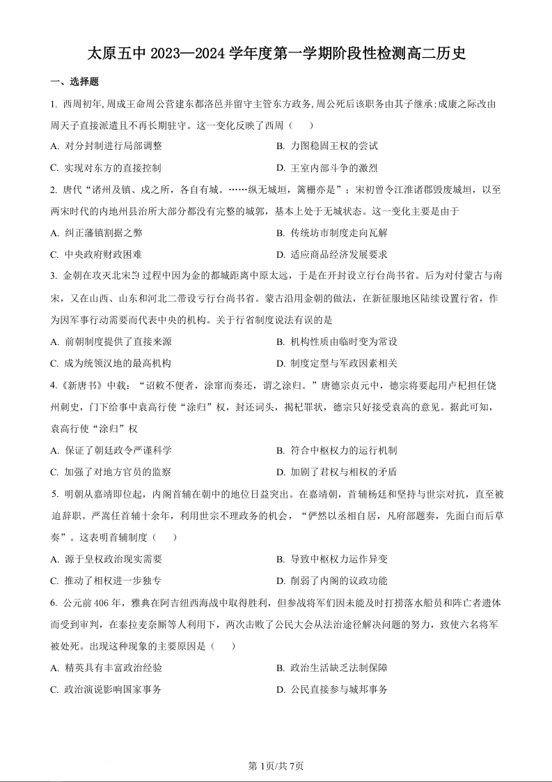 山西省太原市第五中学校2023-2024学年高二上学期10月月考试题历史(原卷版)