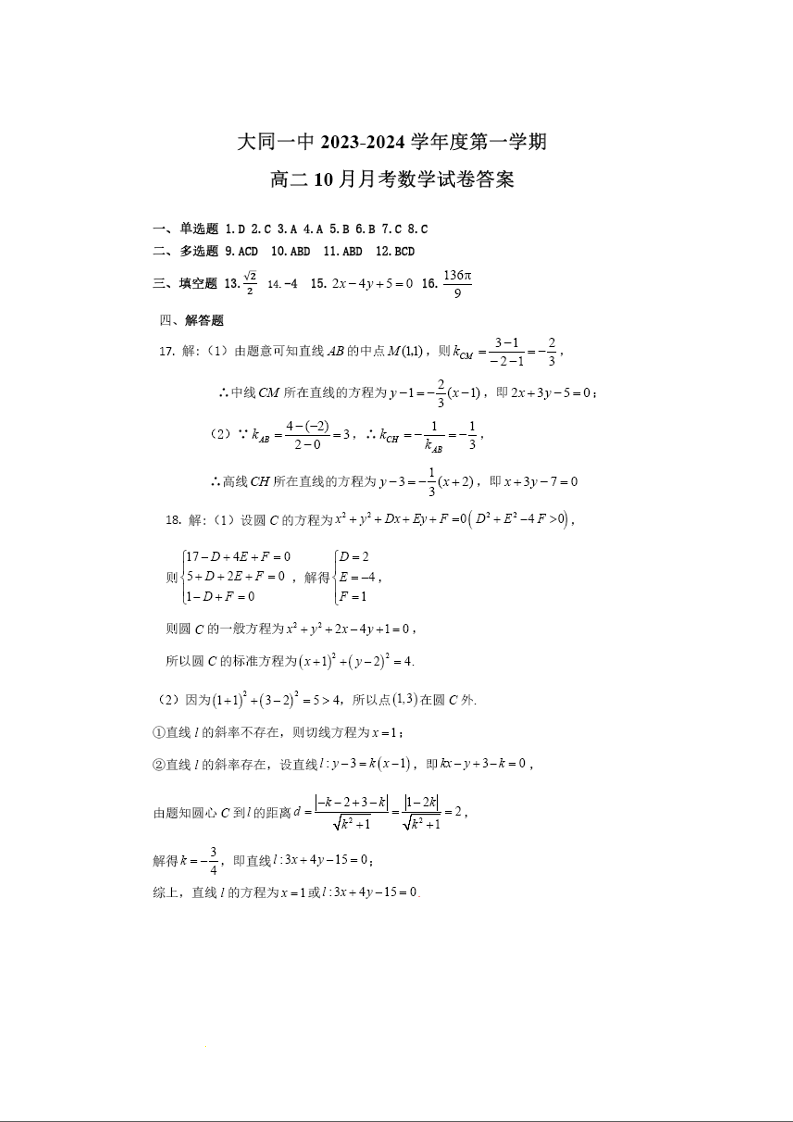 山西省大同市第一中学校2023-2024学年高二上学期10月月考数学答案