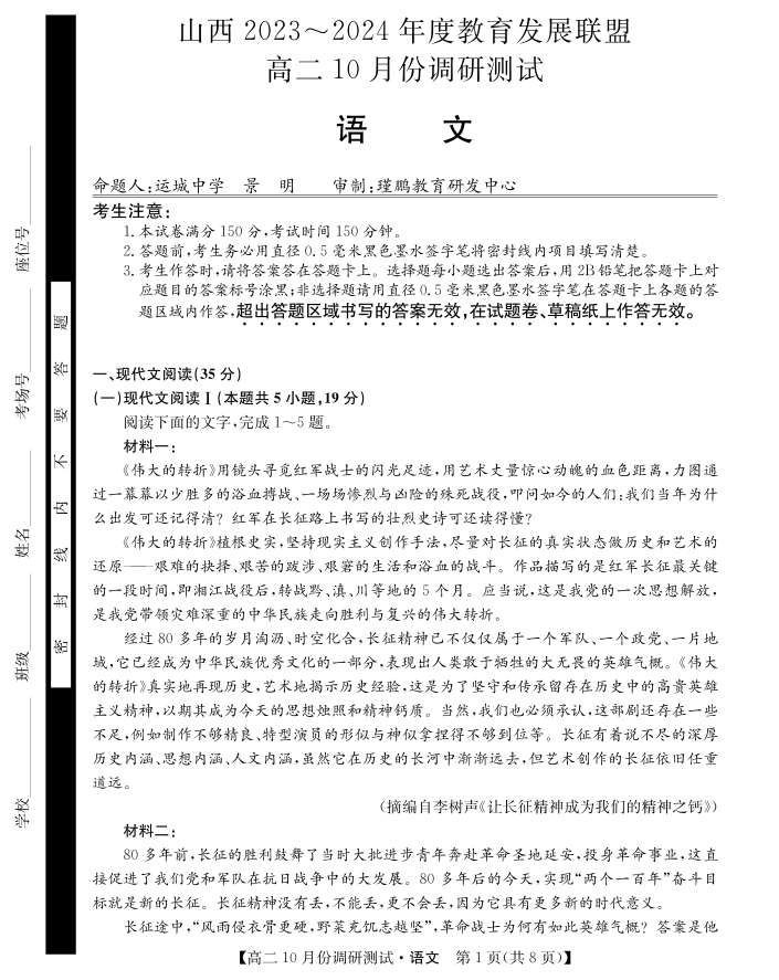山西省运城市教育发展联盟2023-2024学年高二上学期10月月考语文