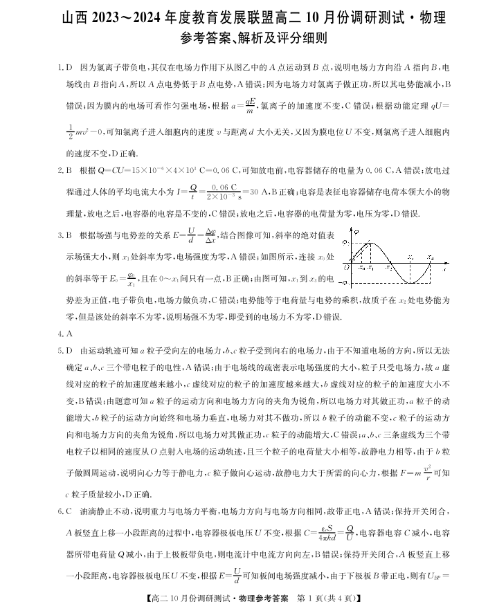 山西省运城市教育发展联盟2023-2024学年高二上学期10月月考物理答案