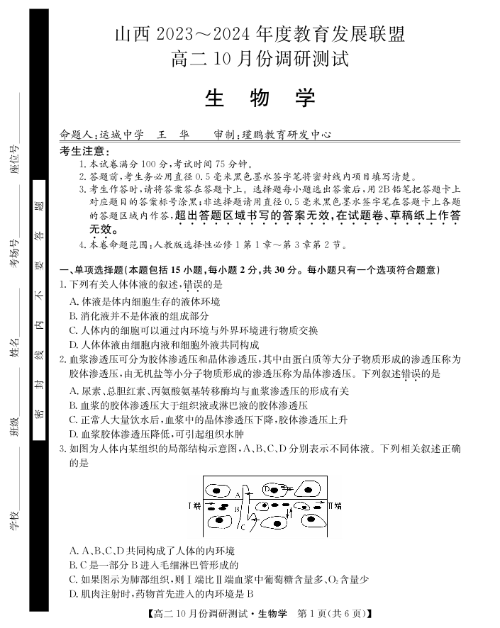 山西省运城市教育发展联盟2023-2024学年高二上学期10月月考生物