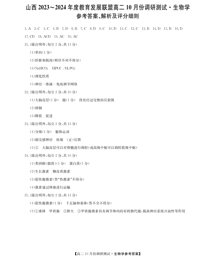 山西省运城市教育发展联盟2023-2024学年高二上学期10月月考生物答案