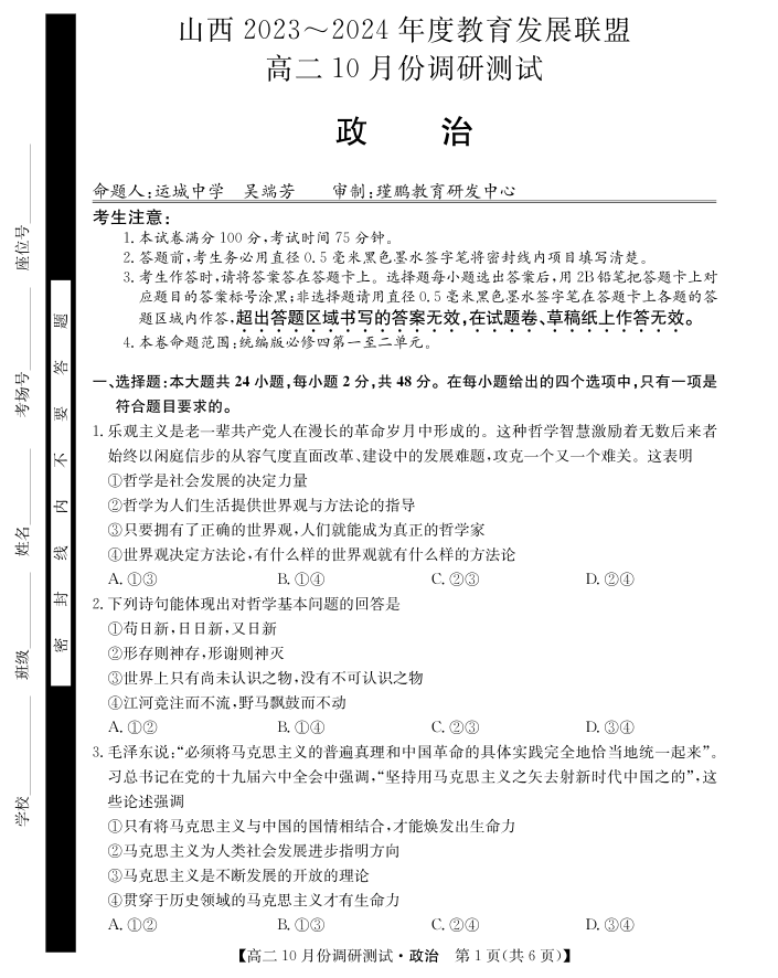 山西省运城市教育发展联盟2023-2024学年高二上学期10月月考政治