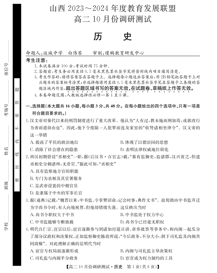 山西省运城市教育发展联盟2023-2024学年高二上学期10月月考历史