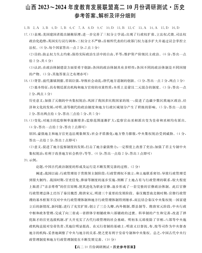 山西省运城市教育发展联盟2023-2024学年高二上学期10月月考历史答案