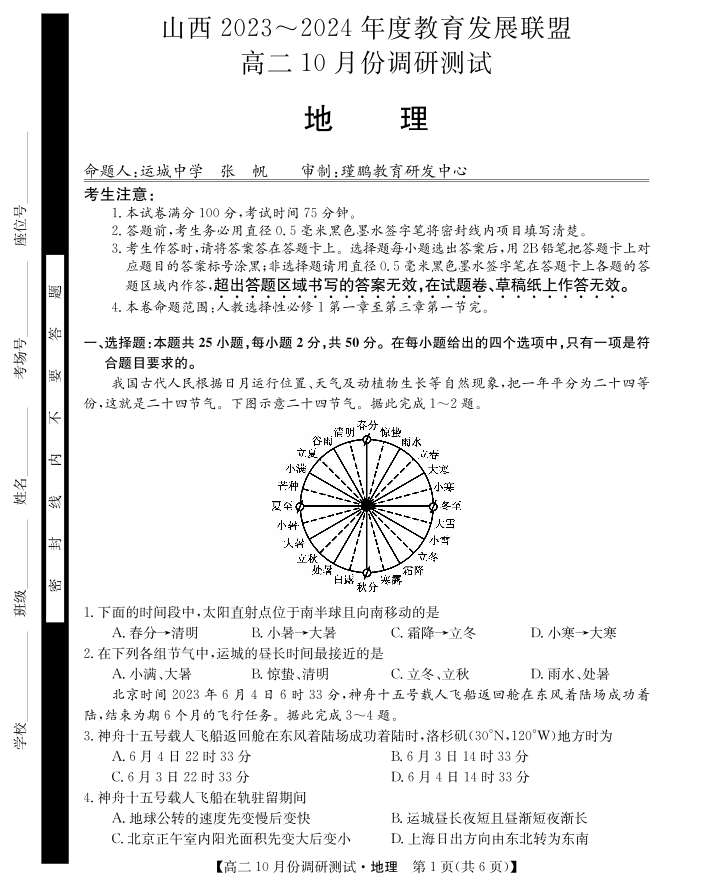 山西省运城市教育发展联盟2023-2024学年高二上学期10月月考地理
