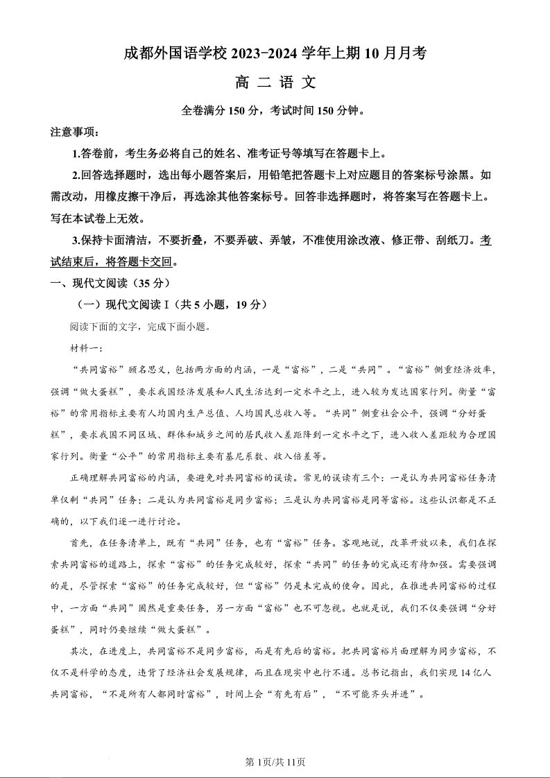 四川省成都市外国语学校2023-2024学年高二10月月考语文(原卷版)