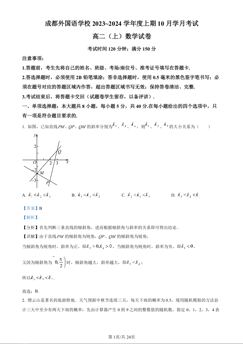 四川省成都市外国语学校2023-2024学年高二10月月考数学(精品解析版)