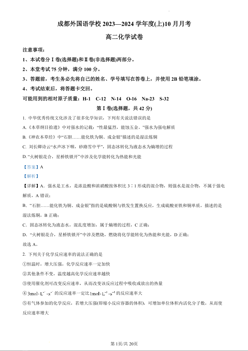 四川省成都市外国语学校2023-2024学年高二10月月考化学(精品解析版)