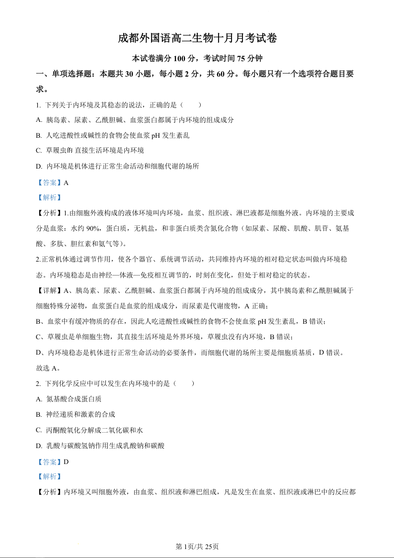 四川省成都市外国语学校2023-2024学年高二10月月考生物(精品解析版)