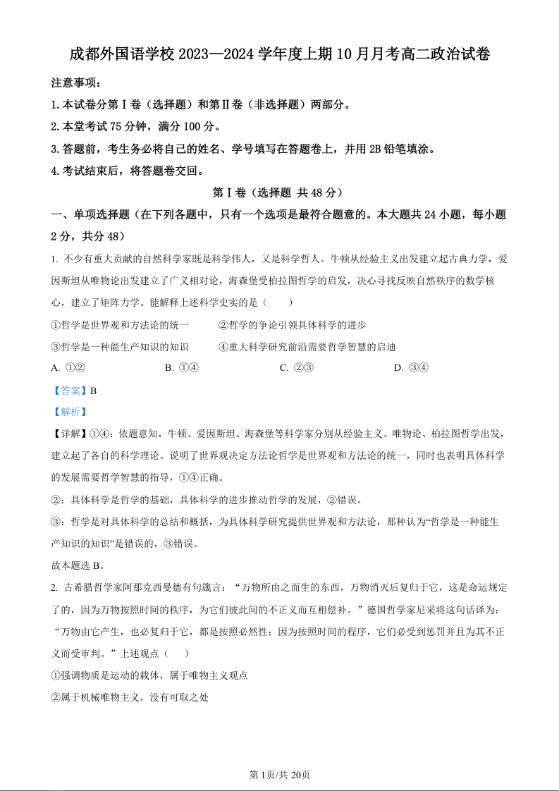 四川省成都市外国语学校2023-2024学年高二10月月考政治(精品解析版)