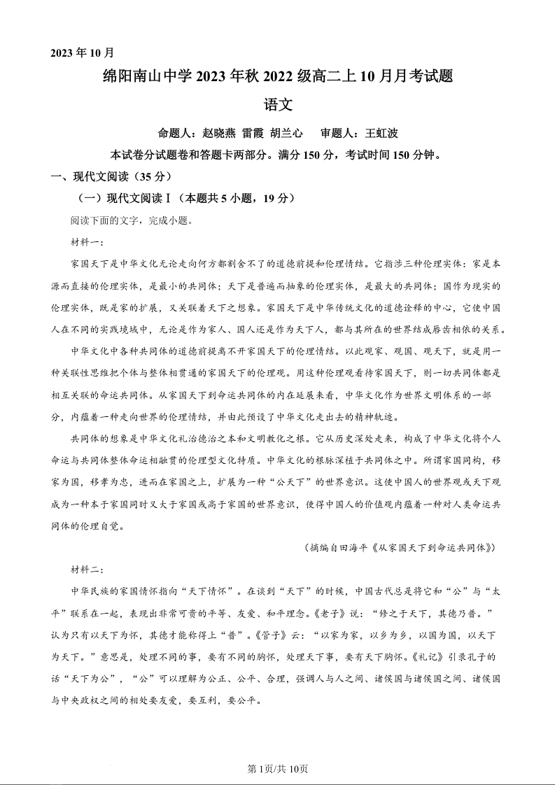 四川省绵阳市南山中学2023-2024学年高二10月月考语文(原卷版)