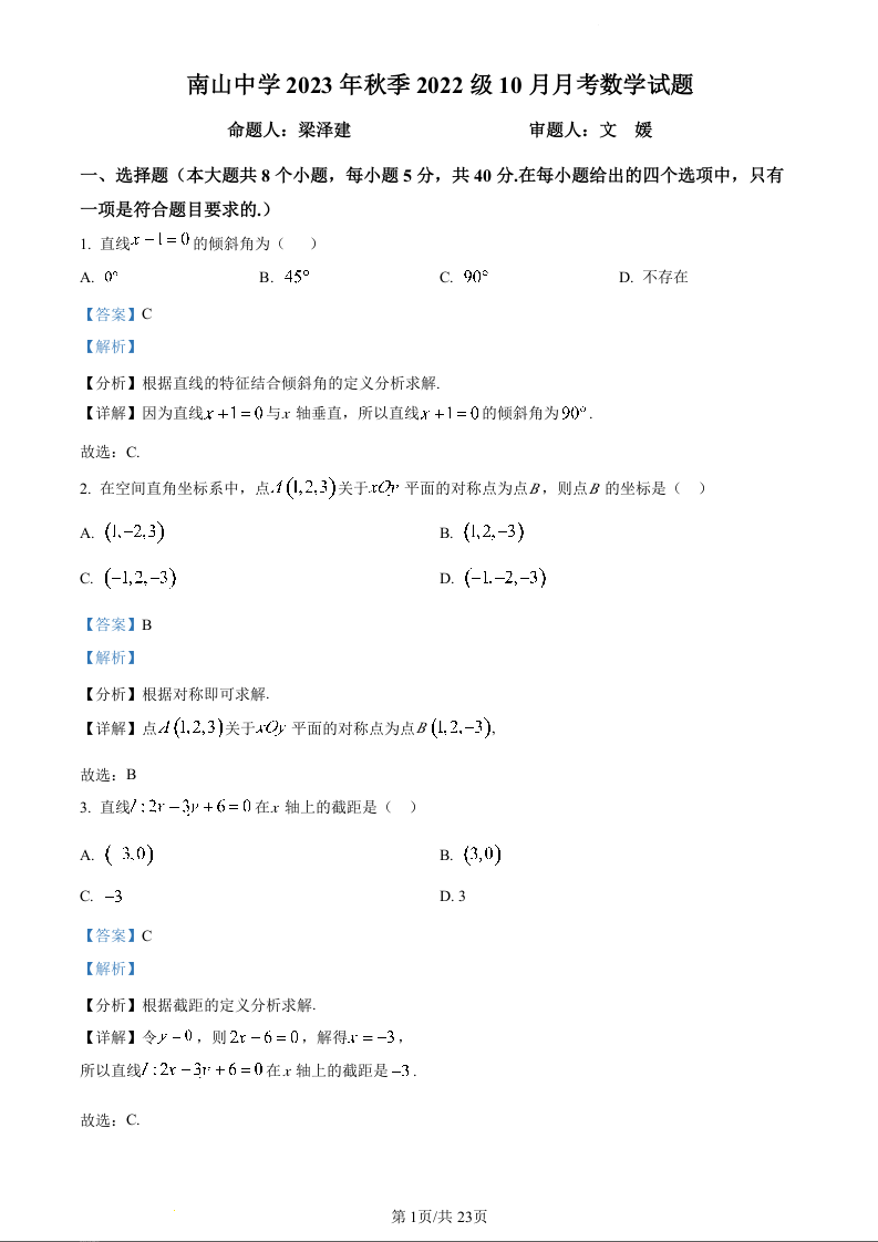 四川省绵阳市南山中学2023-2024学年高二10月月考数学(精品解析版)