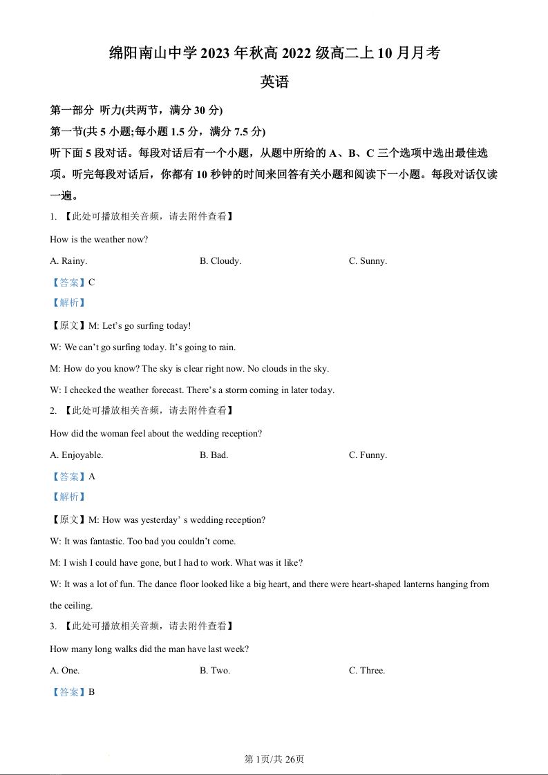四川省绵阳市南山中学2023-2024学年高二10月月考英语(精品解析版)