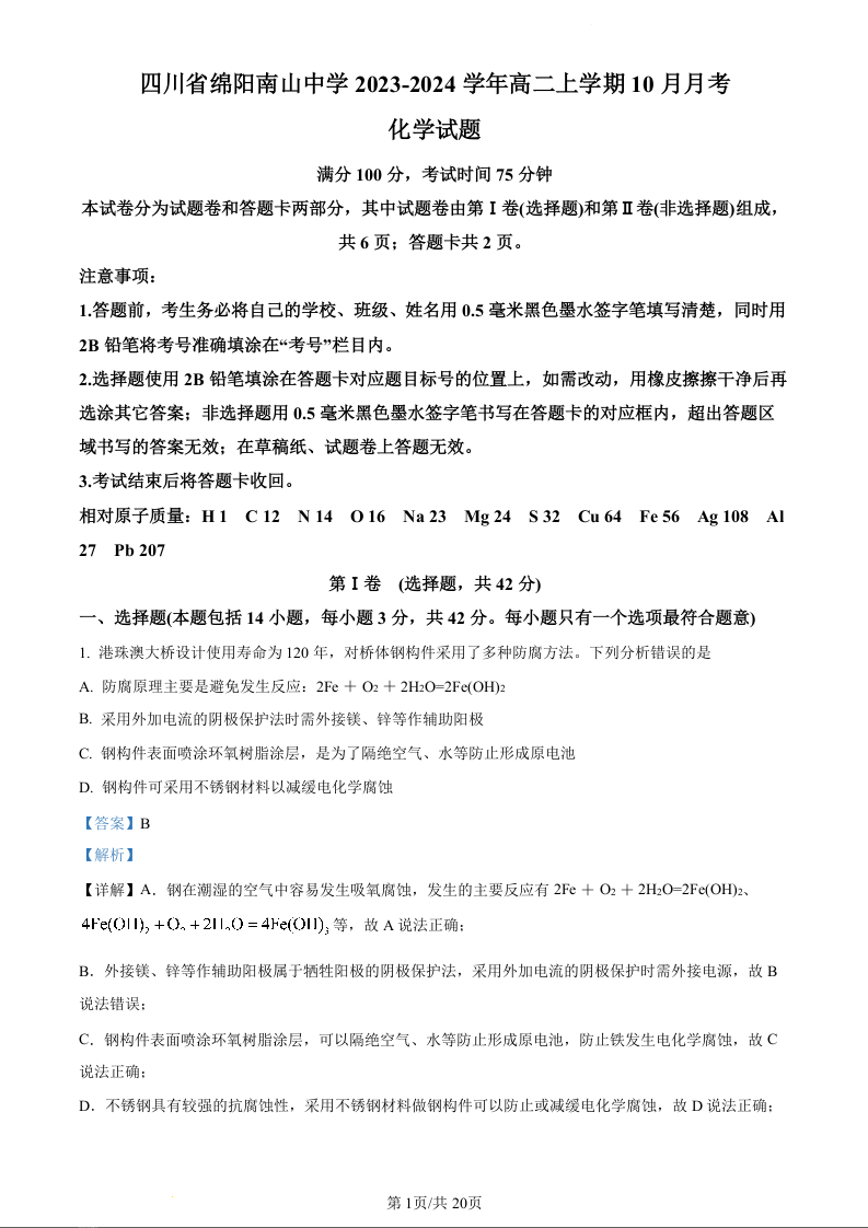 四川省绵阳市南山中学2023-2024学年高二10月月考化学(精品解析版)