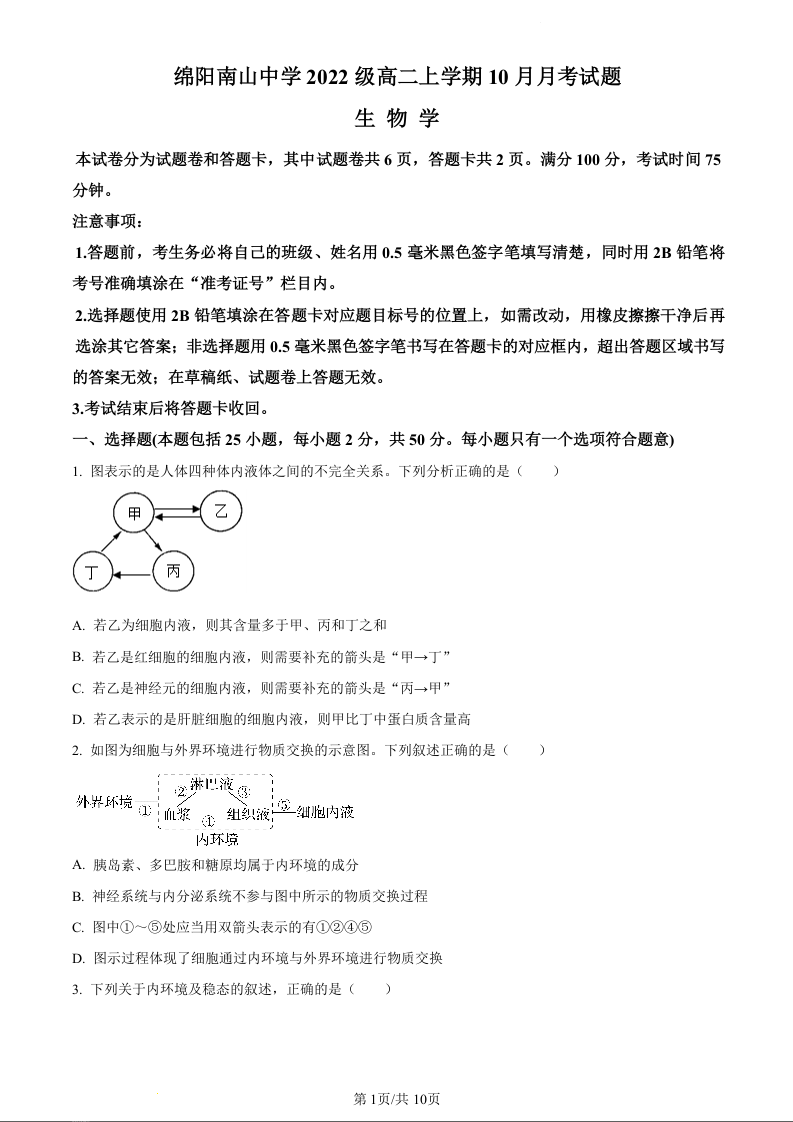四川省绵阳市南山中学2023-2024学年高二10月月考生物(原卷版)