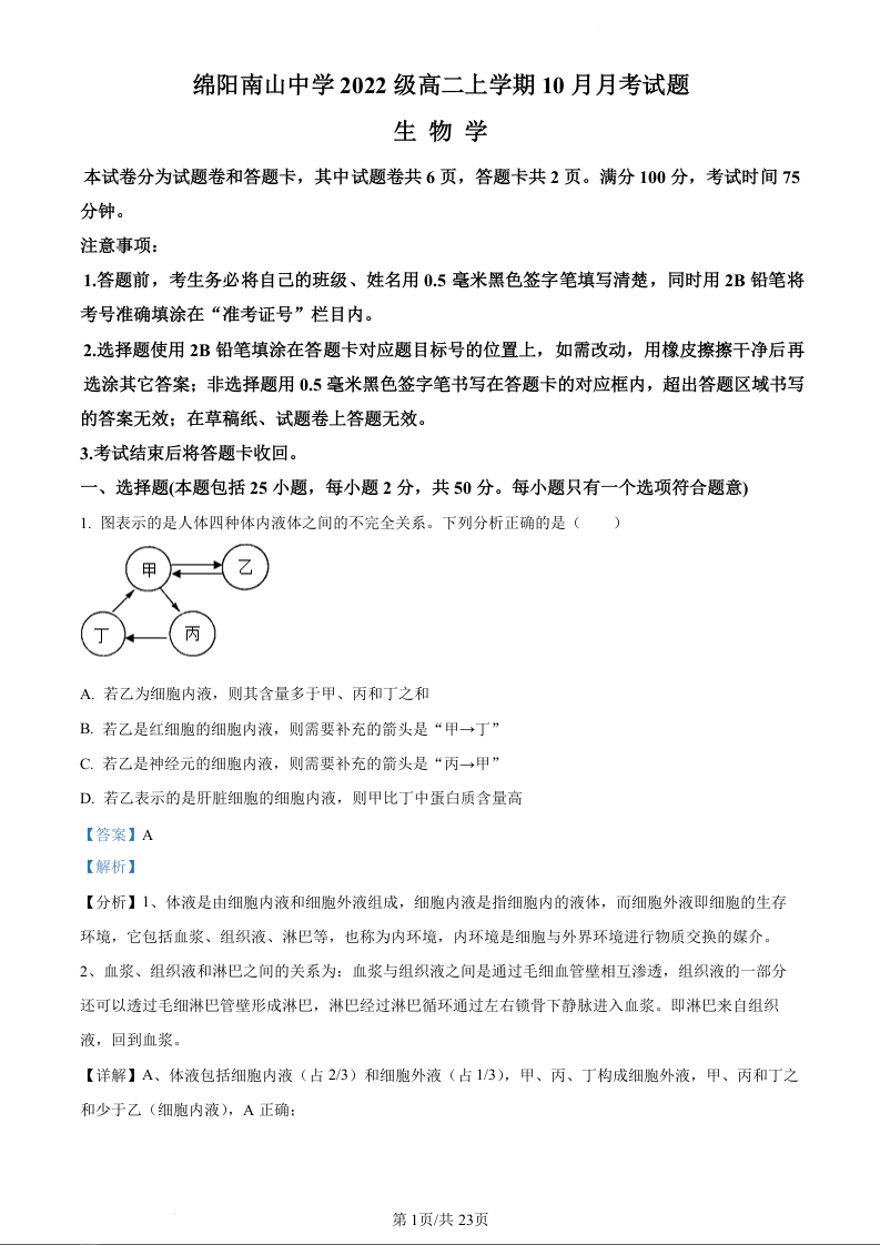 四川省绵阳市南山中学2023-2024学年高二10月月考生物(精品解析版)