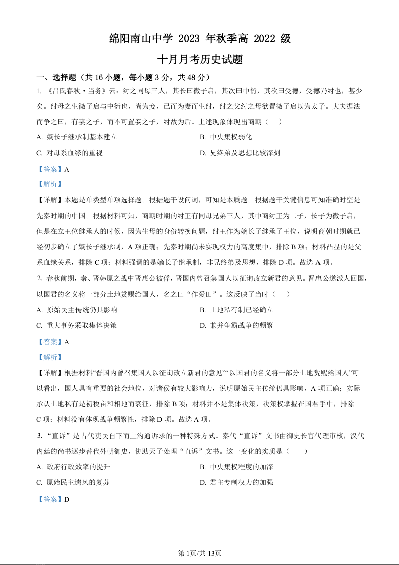 四川省绵阳市南山中学2023-2024学年高二10月月考历史(精品解析版)