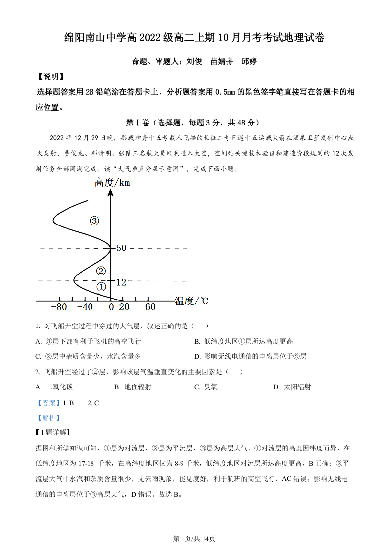 四川省绵阳市南山中学2023-2024学年高二10月月考地理(精品解析版)
